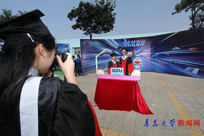 場館外,學校搭建了“畢業小鎮”,設置了“青青校園”“青大時光機”“我們畢業了”“鏤空畢業證”“學在青大”等主題元素的簡易背景墻,畢業生們紛紛在此合影留念。