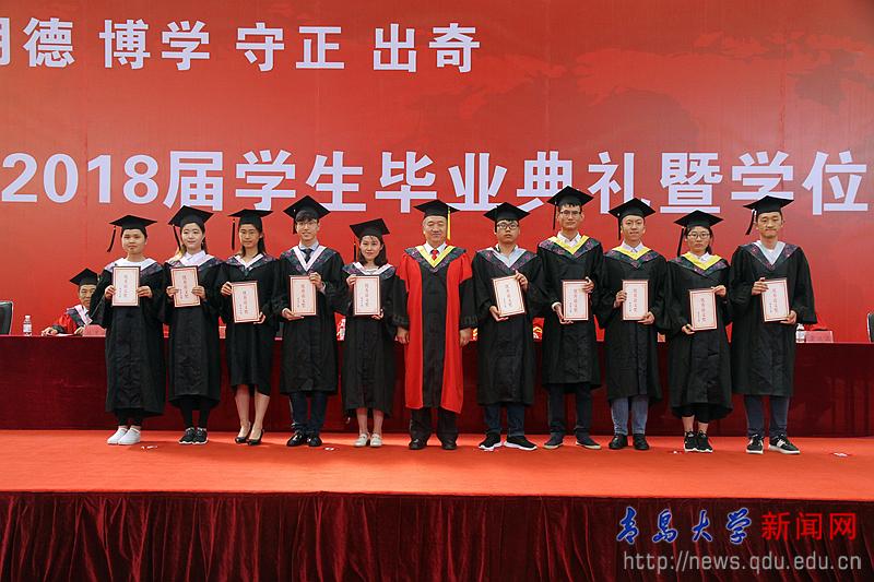 畢業典禮上,校學位評定委員會副主席、校黨委常委、副校長于永明宣讀了《青島大學2018年夏季關于授予博士、碩士學位及學士學位的決議》。校黨委常委、副校長邵彬宣讀了《青島大學關于表彰2018屆優秀博士、碩士、學士學位論文獲獎得者的決定》。校黨委副書記杜方波宣讀了《青島大學關于表彰2018屆優秀畢業生的決定》,胡金焱、儀垂杰分別為優秀畢業生代表和優秀論文獲得者代表頒發了證書。