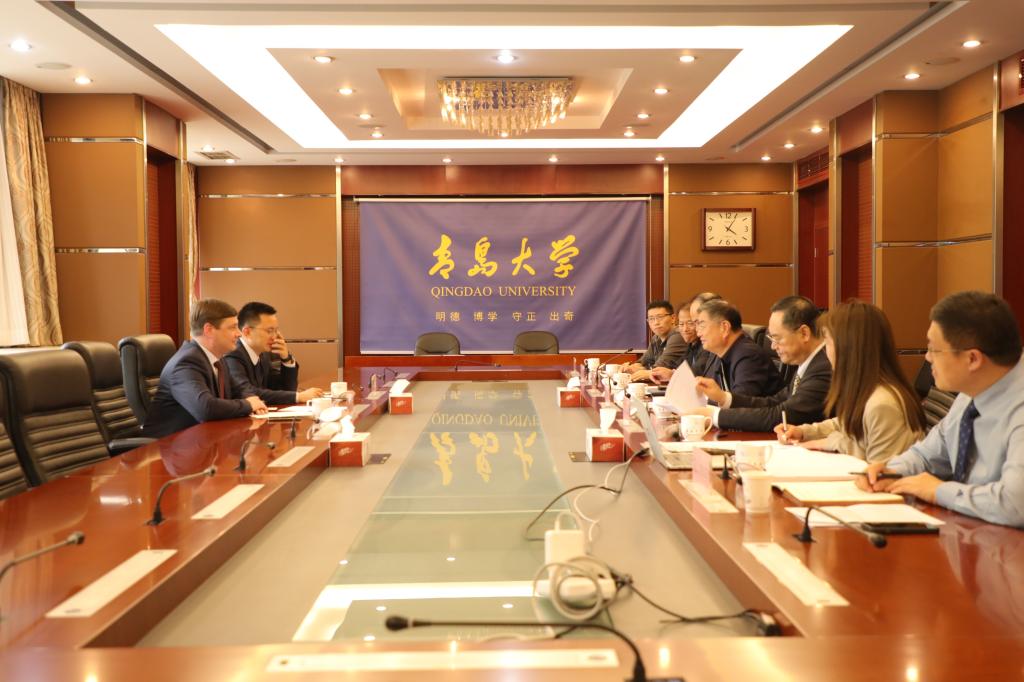 夏東偉對客人來訪表示熱烈歡迎。他簡要介紹了青島大學的基本情況和發展概況。他指出,圣彼得堡國立大學和青島大學兩校合作淵源深厚,合作基礎扎實。作為圣彼得堡國立大學的優秀校友和友好使者,我校數學科學學院院長高紅偉教授發揮了重要作用。2017年,我校數學與統計學院和圣彼得堡國立大學應用數學與控制過程系共同申報的項目入選山東省“外專雙百計劃”項目。2018年,圣彼得堡國立大學一位博士成功入選中國“博士后國際交流計劃”引進項目,進入青島大學系統科學博士后科研流動站。截止到2022年11月,“外專雙百計劃”項目團隊以青島大學為第一署名單位、標注項目資助出版學術專著1部、發表高水平論文合計43篇,含SCI/SSCI收錄論文35篇,其中包括IJGT, EJOR等5篇,中外合作署名發表在SCI/SSCI收錄期刊的論文20篇。2020年,雙方簽署校際合作協議。2021年和2023年,我校還獲批國家留學基金委兩個促進與俄烏白國際合作培養項目,派出赴圣彼得堡國立大學學生43人。夏東偉強調,圣彼得堡國立大學作為一所對人類文明進步作出重大貢獻的大學,我們期待著雙方一道,進一步夯實合作基礎,增進合作共識,推動雙方合作向更深層次、更高水平邁進,為構建人類命運共同體作出積極貢獻。