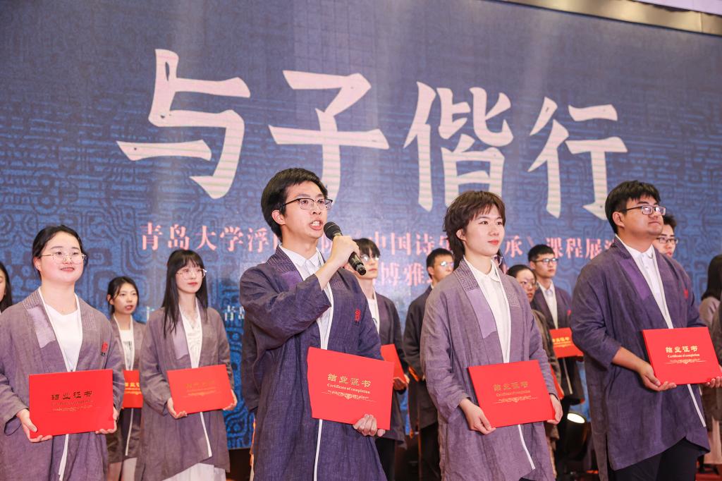 新聞網訊 6月3日晚,浮山書院“與子偕行”——“中國詩樂舞傳承”課程展演暨第十三屆博雅班畢業典禮在國際學術交流中心博學廳舉行。青島市委宣傳部常務副部長姜劍超,青島市人大常委王為達、王岐,新華社青島支社社長徐冰,山東省廣播電視臺駐青島記者站主任叢芳受邀出席。學校原黨委書記夏臨華,校黨委常委、副校長孔偉金,青島市文聯主席、美術學院院長王紹波及相關職能部門、學院領導與來自全校各學院400余名學生代表一起觀看了展演和典禮。