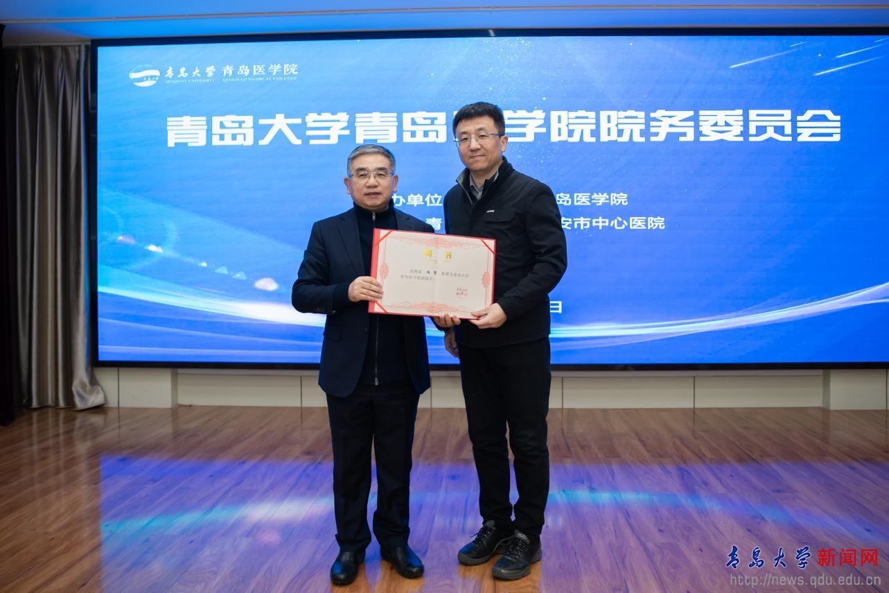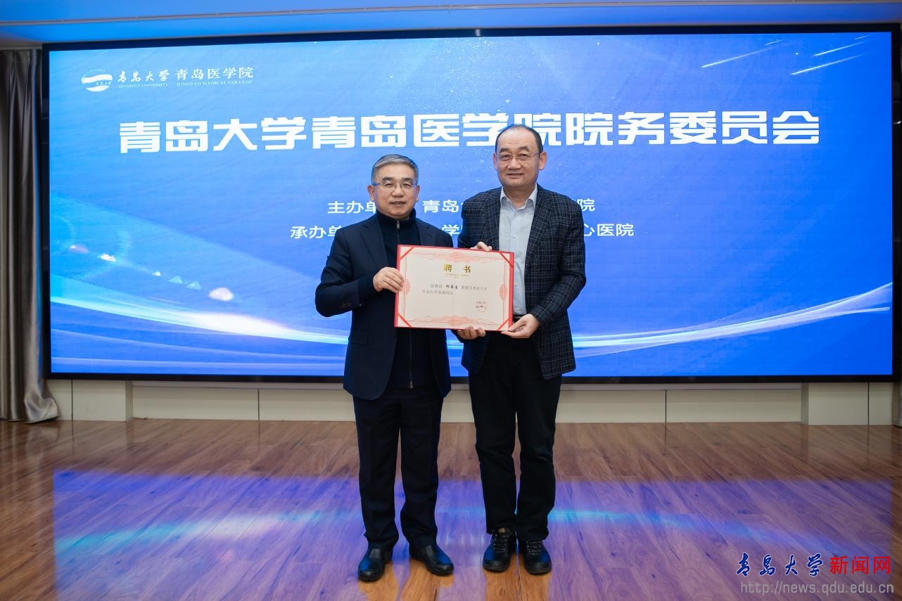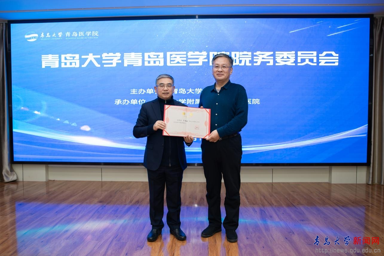 會前,李榮貴宣讀《關于調整青島大學青島醫學院院長、副院長聘任及院務委員會的通知》。胡金焱為新任院長、副院長頒發聘書。