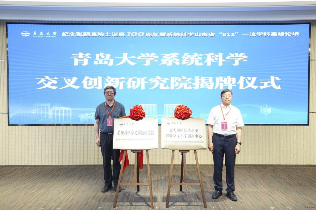 會上,青島大學系統科學交叉創新研究院暨超大規模復雜系統智能交叉科學創新中心揭牌儀式隆重舉行,魏志強和郭雷共同為研究院揭牌。