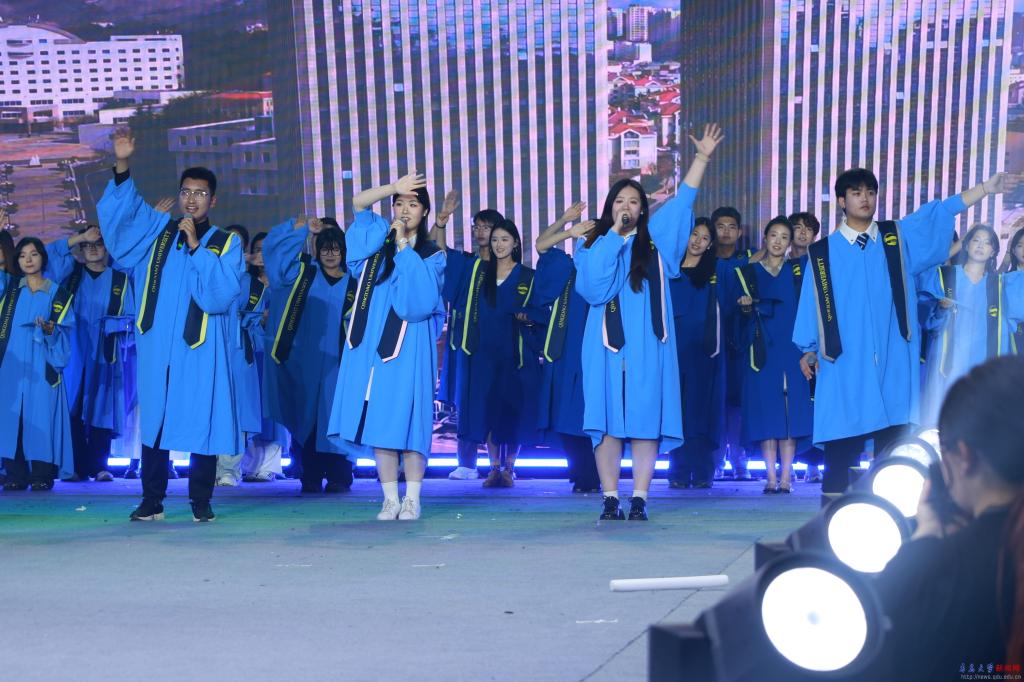 晚會融合了樂團、電聲樂隊、情景演唱、舞蹈、相聲、朗誦等多種精彩表演形式,并與精心設計的服裝走秀相得益彰,打造了一場立體而多元的現場演出。在回憶往昔的時光里,深情的歌聲傳遞了畢業生們難舍的離別之情;在把握當下的青春年華中,堅定的姿態展現了青大青年奮勇向前的青春風采;在展望未來的旅途中,激昂的旋律描繪了新時代青大青年奮發向前的壯志豪情。