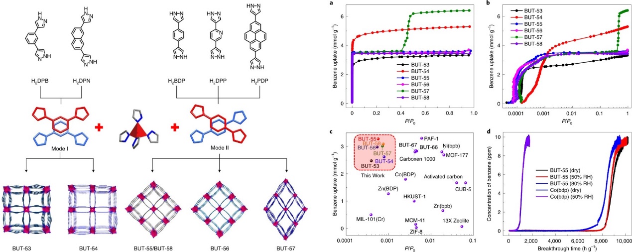 圖1. BUT-53~BUT-58的構筑策略及苯吸附性能研究。