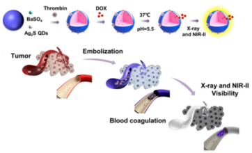 經(jīng)導(dǎo)管動脈栓塞術(shù)在腫瘤介入治療中有巨大作用。本研究報道了一種基于明膠的栓塞微球,具備NIR-II熒光成像和X射線成像雙重成像功能。將DOX裝入微球內(nèi)部,并鍵合凝血酶協(xié)同治療腫瘤。我校博士生高鳳苑與碩士生韓婷婷為第一作者,生物醫(yī)用材料與工程研究院為第一通訊單位。(全文鏈接:https://doi.org/10.1021/acsmaterialslett.3c00164