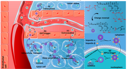 藥物在腫瘤組織中的低滲透嚴重影響其療效。本研究報道了一種雙響應(yīng)型藥物載體。當(dāng)納米載體暴露于腫瘤細胞,GGT觸發(fā)發(fā)生電荷反轉(zhuǎn),提高主動轉(zhuǎn)運能力。同時TAT可將藥物轉(zhuǎn)運至核仁,釋放DOX產(chǎn)生抗腫瘤活性。相關(guān)研究發(fā)表在Biomaterials上。我校材料科學(xué)與工程學(xué)院碩士研究生閆涵為第一作者,生物醫(yī)用材料與工程研究院為第一通訊單位。(全文鏈接:https://doi.org/10.1016/j.biomaterials.2023.122213