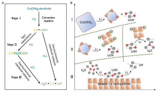 為了揭示這一關(guān)鍵科學(xué)問題,該工作對(duì)典型的Co(OH)2/Li電池體系進(jìn)行了深入研究,并取得了重要進(jìn)展。結(jié)合微觀電鏡、光譜分析、磁性測試和密度泛函理論計(jì)算闡明了Co基電極材料中涉及自旋極化電子轉(zhuǎn)移的電化學(xué)界面催化反應(yīng)全過程(上圖),揭示了電化學(xué)驅(qū)動(dòng)演化過程中的局部化學(xué)、電子結(jié)構(gòu),以及它們與電化學(xué)性能的聯(lián)系。以Co(OH)2為模型電極,監(jiān)測不同施加電壓下的Co金屬中心。結(jié)果發(fā)現(xiàn)在典型的界面催化反應(yīng)進(jìn)行之前,由于自旋極化電子的注入,金屬Co納米顆粒/LiOH界面處首先出現(xiàn)自旋極化表面電容并存儲(chǔ)界面電荷。隨后,金屬Co納米顆粒作為催化活化中心,會(huì)轉(zhuǎn)移這些貯存的電子以促進(jìn)LiOH分解。有趣的是,在LiOH分解電位下,反應(yīng)過程中涉及電子的轉(zhuǎn)移導(dǎo)致金屬Co納米粒子的電子結(jié)構(gòu)呈現(xiàn)出周期性動(dòng)態(tài)變化。這項(xiàng)工作提供了一種可行的方法來獲取界面催化過程中的關(guān)鍵信息,并為監(jiān)測更廣泛電化學(xué)系統(tǒng)中的復(fù)雜界面提供了有力的工具。此外通過建立電極動(dòng)態(tài)結(jié)構(gòu)演變與電化學(xué)性能之間的聯(lián)系來幫助優(yōu)化界面催化劑,可以為構(gòu)建下一代能源系統(tǒng)開辟一條新的途徑。