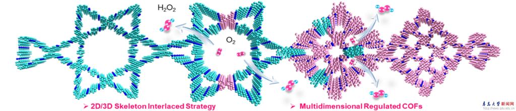 過氧化氫(H2O2)是一種清潔、無污染的化學(xué)能源,在水處理、能源技術(shù)、化學(xué)合成和造紙等方面具有廣泛的應(yīng)用。目前,用于H2O2生產(chǎn)的傳統(tǒng)蒽醌氧化工藝存在高能耗和環(huán)境污染等問題,因此,氧還原反應(yīng)(ORR)以其分布式小型化設(shè)備和綠色節(jié)能工藝的特點(diǎn)成為清潔H2O2可持續(xù)經(jīng)濟(jì)生產(chǎn)的一種有效手段。共價(jià)有機(jī)框架(COFs)材料具有組分可調(diào)、孔道結(jié)構(gòu)高度有序、比表面積大、易于功能化修飾等優(yōu)點(diǎn),為開發(fā)功能性材料提供了強(qiáng)大的平臺(tái)。此外,它們?cè)诳蚣鼙砻尕S富的活性位點(diǎn)和明確的晶體孔隙率在多相催化中表現(xiàn)出巨大的前景。眾所周知,多組分COFs在物理化學(xué)功能方面比雙組分體系中具有突出的優(yōu)勢,成為一種有效的調(diào)控策略。但目前多組分的報(bào)道主要集中在同一維度,而對(duì)于具有2D和3D單元交錯(cuò)的多組分COFs的拓?fù)淇刂粕儆醒芯俊R虼耍匀蝗狈Χ嗑S度和多組分協(xié)效調(diào)控的方法來開發(fā)高效非金屬COFs基電催化劑。