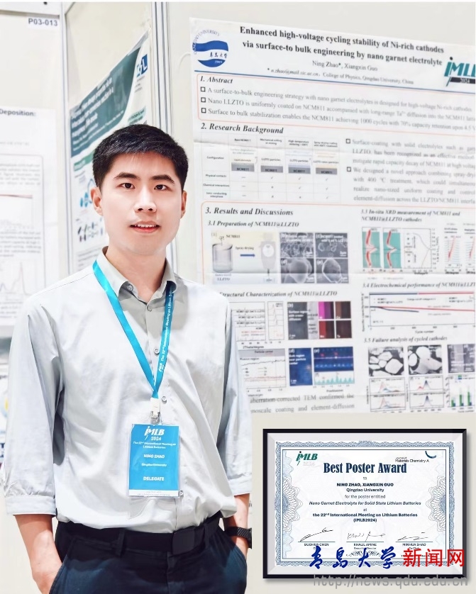 獲獎的學術海報圍繞納米石榴石型固體電解質在鋰電池中的應用,對引入鋰鑭鋯氧固體電解質的二次鋰電池中的關鍵問題進行了探討,揭示了納米鋰鑭鋯氧固體電解質對正極材料晶格與表界面微結構的調控機制。近年來,青島大學固態電池研究團隊基于對固體電解質材料與固態電池的持續研發,從基礎研究到應用開發取得系列進展,團隊負責人郭向欣教授作為首席科學家獲批國家重點研發計劃和國家自然科學基金重點項目,建有固態電池山東省工程研究中心等工程化平臺。本次學術交流是青島大學“新能源+”學科群建設取得的又一成果,對于提升青島大學國際學術影響力具有重要作用。