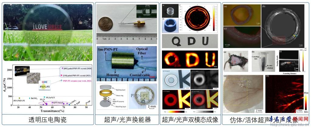 近年來(lái),物理科學(xué)學(xué)院積極推進(jìn)“醫(yī)理工”多學(xué)科交叉融合,在新一代光聲成像技術(shù)、太赫茲成像精準(zhǔn)醫(yī)療、靜電紡絲快速止血、醫(yī)用氣體傳感器等方面取得系列成果。張永成團(tuán)隊(duì)從事透明壓電陶瓷及應(yīng)用研究多年,通過稀土元素?fù)诫s改性和燒結(jié)工藝優(yōu)化,率先制備出壓電系數(shù)大于1400pC/N、未鍍?cè)鐾改r(shí)近紅外光透過率達(dá)68%(接近理論極限)的二元PMN-PT透明壓電陶瓷(ACS Appl. Mater. Interfaces, 13, 54210?54216(2021);Journal of Alloys and Compounds 1010, 177640(2025))以及壓電系數(shù)900-1000pC/N、具有高居里點(diǎn)和高溫度穩(wěn)定性的三元PIN-PMN-PT透明壓電陶瓷(Appl. Phys. Lett. 125, 242905 (2024);ACS Appl. Mater. Interfaces 15, 7053?7062(2023))。所報(bào)道的性能均為該體系的最高值,且遠(yuǎn)高于其它已報(bào)道的鉛基和無(wú)鉛透明壓電陶瓷。通過物相結(jié)構(gòu)、顯微結(jié)構(gòu)以及鐵電疇結(jié)構(gòu)的觀察與分析,揭示了其高透明與高壓電共存的機(jī)理。在此基礎(chǔ)上分別與中科院深圳先進(jìn)技術(shù)研究院、上海理工大學(xué)合作設(shè)計(jì)制作了中心頻率為16-28MHz的透明光聲換能器以及30MHz的高頻超聲換能器,并基于該體系換能器首次實(shí)現(xiàn)了對(duì)仿體和活體進(jìn)行了光聲/超聲多模態(tài)成像。如豬動(dòng)脈血管的超聲成像(Ultrasonic Imaging, 46, 312-319(2024))、小鼠體內(nèi)分子探針的超聲/光聲成像(Nano Energy 132,110390 (2024)),活體小鼠耳朵的皮下微血流的光聲成像(Journal of Materiomics,100932(2024))等。結(jié)果表明基于高性能透明壓電陶瓷設(shè)計(jì)的超聲/光聲換能器的帶寬和成像效果得到明顯提升,未來(lái)有望應(yīng)用于醫(yī)學(xué)成像和診斷,為人民生命健康保駕護(hù)航。