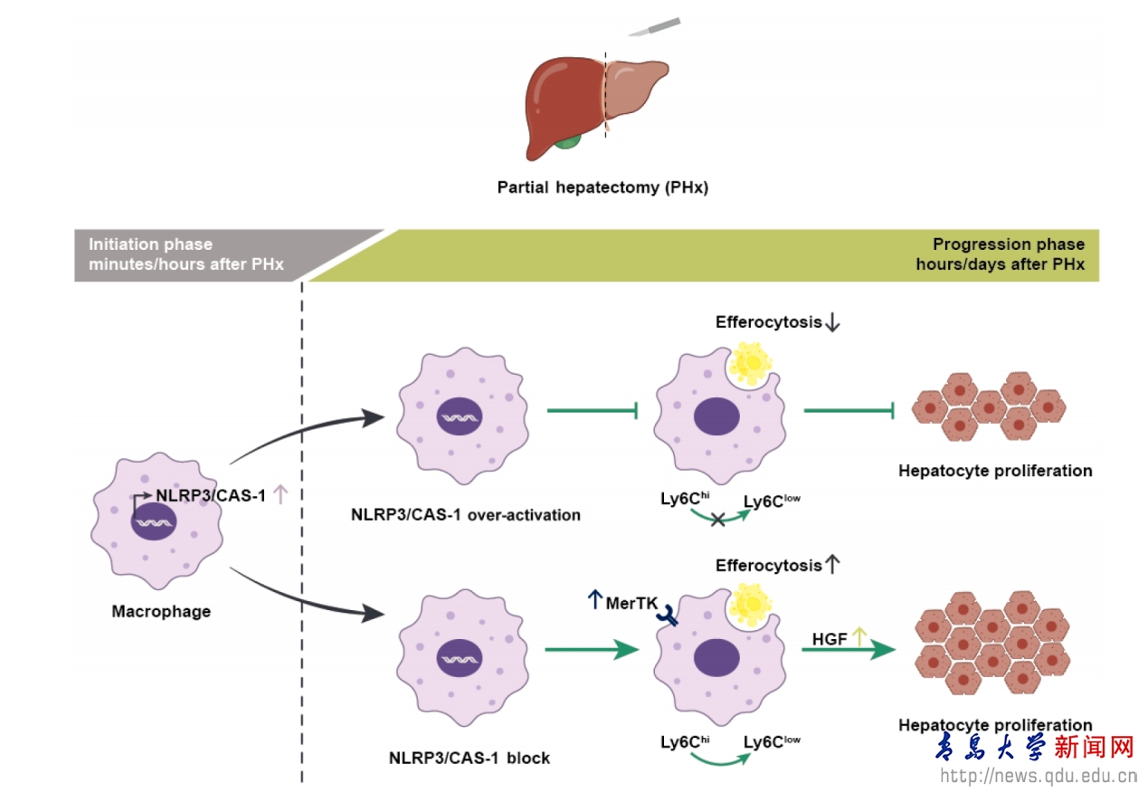 新聞網(wǎng)訊 近日,基礎(chǔ)醫(yī)學(xué)院狄國虎、陳鵬教授課題組團(tuán)隊在Science子刊ScienceAdvances雜志在線發(fā)表了題為“NLRP3 Inflammasome Constrains Liver Regeneration Through Impairing MerTK Mediated Macrophage Efferocytosis”的研究論文(IF=11.7,DOI: 10.1126/sciadv.adq5786)。該研究揭示了巨噬細(xì)胞NLRP3炎癥小體在限制肝臟再生中的重要作用,并為靶向NLRP3提供了新的治療策略。2020級特種醫(yī)學(xué)碩士研究生韋素素(現(xiàn)就職于齊魯中科現(xiàn)代微生物技術(shù)研究院)、青島大學(xué)附屬醫(yī)院器官移植中心副主任醫(yī)師關(guān)鴿、2021級特種醫(yī)學(xué)碩士研究生欒曉瑜(現(xiàn)博士就讀于中國科學(xué)院遺傳與發(fā)育生物學(xué)研究所)、2021級特種醫(yī)學(xué)博士研究生于超群為共同第一作者。基礎(chǔ)醫(yī)學(xué)院狄國虎教授、陳鵬教授為共同通訊作者。基礎(chǔ)醫(yī)學(xué)院為第一完成單位和唯一通訊單位。該研究受到科技部重點研發(fā)計劃、山東省自然科學(xué)基金、山東省高校青創(chuàng)團(tuán)隊計劃、青島市科技惠民師范專項和青島大學(xué)“醫(yī)學(xué)+”課題等項目的資助。