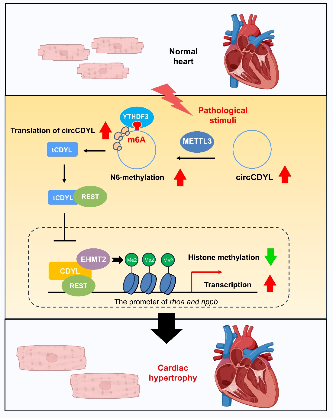 病理性心肌肥大是心肌在不良影響下的一種代償性變化,若無法獲得有效治療最終將發展為不可逆的心力衰竭。該研究從高通量數據中篩選出了在物種中保守同時與病理性心肌肥大高度相關的環形RNA-circCDYL,并通過細胞水平實驗證明了circCDYL能夠直接導致心肌細胞肥大。在機制方面,研究發現病理刺激可上調circCDYL的表達并激活心肌細胞中的甲基轉移酶METTL3對circCDYL進行m6A修飾。在受到修飾后CircCDYL可招募YTHDF3啟動翻譯、產生一種名為tCDYL-100的多肽。該多肽的氨基酸序列與CDYL(Chromodomain Y-like)蛋白高度重合,能夠與CDYL競爭結合轉錄抑制因子REST(RE1-silencing transcription factor)并阻止REST、CDYL以及EHMT2(Euchromatic histone-lysine N-methyltransferase 2)形成轉錄抑制復合體,從而降低促肥大基因rhoa和nppb啟動子區域組蛋白甲基化修飾水平、導致轉錄的激活。在體研究結果顯示,在動物水平特異性沉默心肌中的circCDYL可有效抑制Ang II引起的心肌肥大和心功能破壞,而在心肌中過表達tCDYL-100可直接造成病理性心肌肥大并損害心功能,從而驗證了circCDYL-tCDYL在病理性心肌肥大發展中的重要作用。
