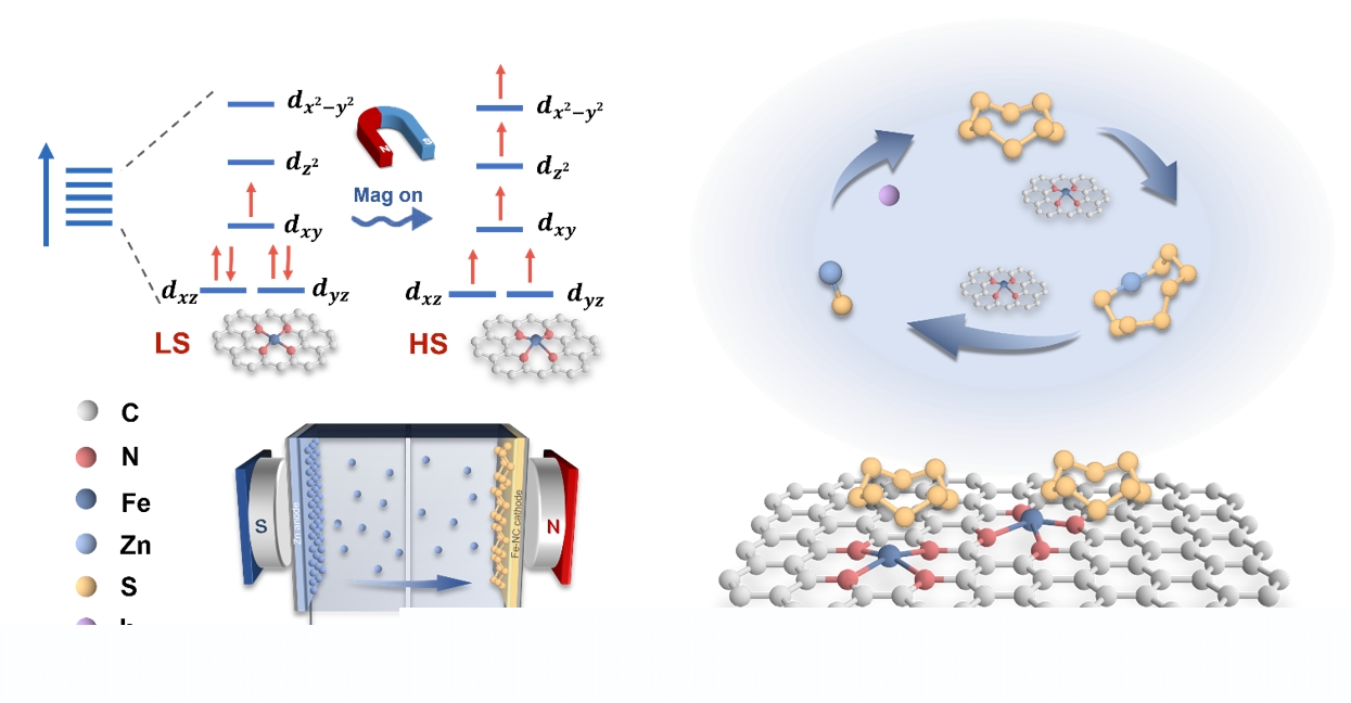 水系鋅硫電池因其高能量密度、原材料豐富以及安全性,近年來被廣泛視為下一代低成本儲能器件的重要候選體系。研究團隊圍繞水系鋅硫電池中磁場對于鐵單原子催化劑自旋態的調節展開深入研究,提出了雙催化(Fe/I-)和磁場調控相結合的雙重策略。研究團隊分別采用I-促進ZnS的氧化過程和用Fe-SAs促進S8的還原過程,優化了水系Zn-S電池的組裝策略。通過磁場誘導鐵活性位點的自旋態調控進一步提高了Fe-SAs的催化性能,通過調控催化劑的自旋態,實現了對硫還原反應路徑的精準調控。研究表明,磁場作用下Fe-SAs的自旋態從低自旋向高自旋轉變,有效提高了鐵單原子催化劑的電子轉移能力,進一步促進了硫正極的還原動力學,顯著提升了鋅硫電池的電化學性能,為新型高催化活性電催化劑提供了新的設計思路。