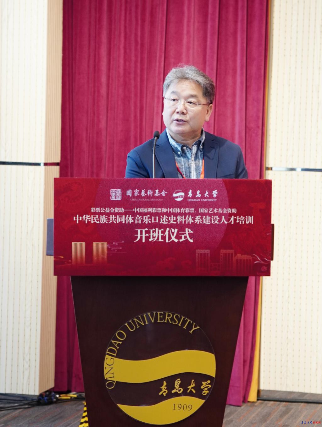 李榮貴在致辭中向到場嘉賓和學員表示歡迎,他簡要介紹了青島大學和藝術學院的發展情況。他表示,此次項目以音樂為紐帶,以口述史為載體,不僅是對中華優秀傳統文化的搶救性保護,更是鑄牢中華民族共同體意識的生動實踐。他希望各位學員帶著對民族文化的敬畏之心、對學術事業的執著追求,全身心投入到項目的學習與實踐中,用腳步丈量土地,用話筒記錄聲音,用文字傳承文明。