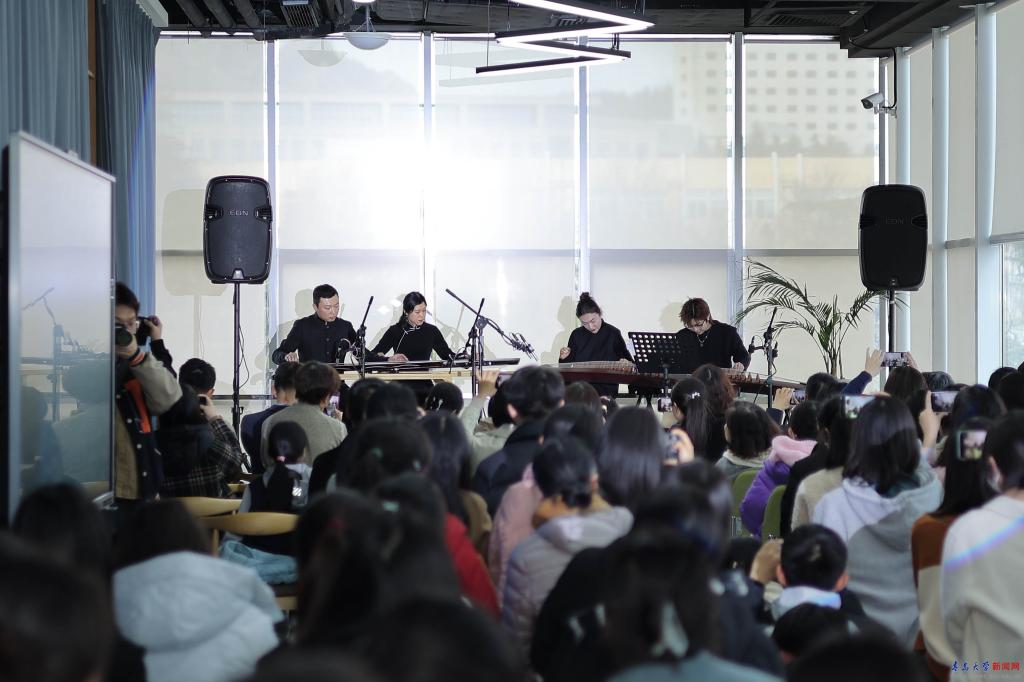“湖畔博雅課”是青島大學浮山書院于2024年春季學期全新開啟、面向全校師生公益開放的文化素質教育第二課堂。“琴·簫·箏”是“湖畔博雅課”中的非遺傳承系列。在開課典禮的音樂會上,青島民族管弦樂學會副會長、青島琴會會長趙霄鵬,古箏專業委員會副會長戰鵬程,古箏專業委員會理事官賽,古琴專業委員會理事于月為現場觀眾講解了古琴、古箏的歷史與樂器特點,獻上了古琴獨奏《流水》《半山聽雨》,古箏二重奏《蝴蝶與藍》《訣別書》以及琴箏四重奏《清平樂》,未能來到現場的劉伽老師也以視頻方式給大家講解了琴簫與洞簫的區別,并為大家演奏了《梅花三弄》。老師們的精彩講解與演奏激起了觀眾們的熱烈掌聲。