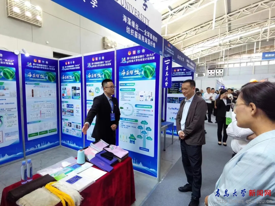 決賽期間,共青團山東省委書記殷世逸一行看望我校參賽作品展區,聽取參賽作品情況匯報,與參賽同學親切交流,對作品的孵化落地等進行指導,并鼓勵參賽團隊充分發揮專業特色,為中國式現代化挺膺擔當。