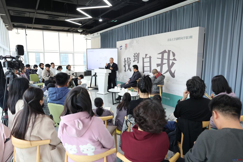 新聞網訊 11月24日下午,浮山書院在文化藝術中心C座三樓舉行“湖畔問學”第3期。浮山書院學術顧問、青島大學原副校長徐宏力教授受邀作為主講人,茶文化踐行者、凈悅山房創始人凈之,美術學院2005級視覺傳達平面設計畢業生、青島嘉博智合品牌設計有限公司總經理步憲壘受邀作為與談人,三位嘉賓圍繞“找到自我”這一主題,與來自各學院的數十名學生進行深入交流。教務處副處長張永進參加活動,浮山書院教師盧文麗主持此次“湖畔問學”。
