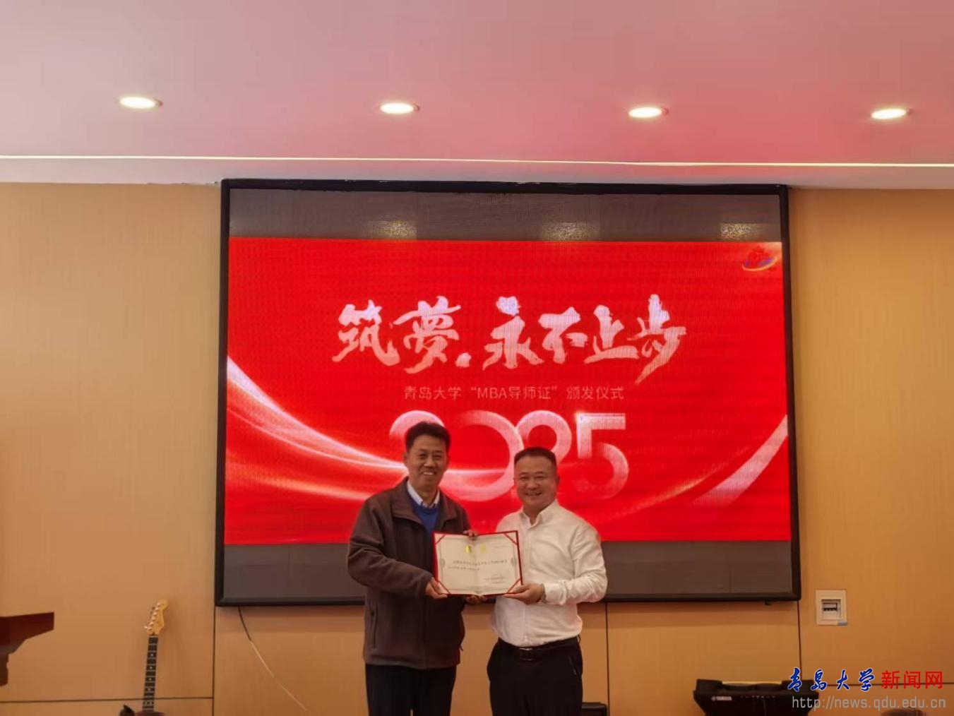 商學(xué)院院長鐘永光為劉鳳昆頒發(fā)青島大學(xué)MBA校外導(dǎo)師證書。