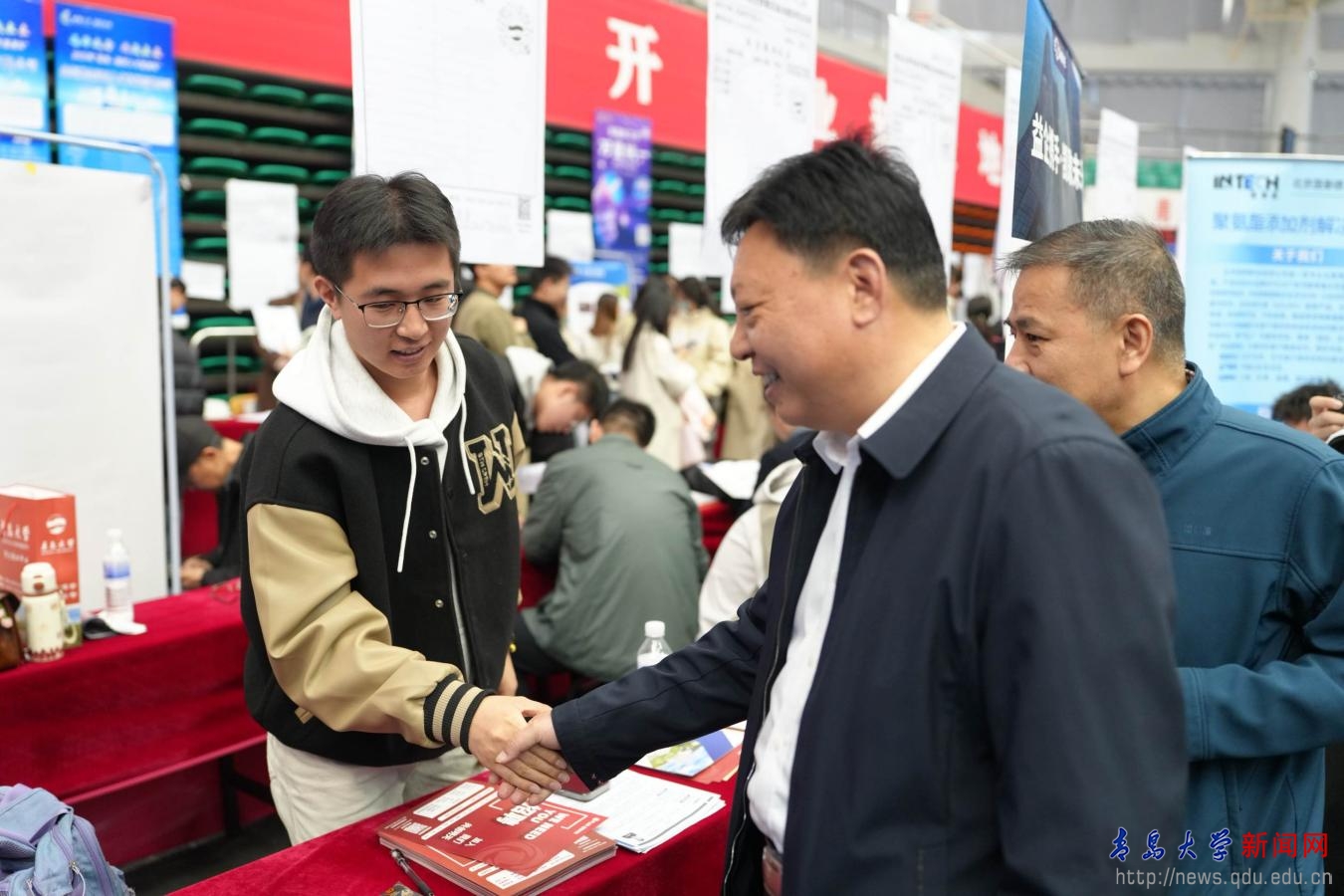 青島大學企業家聯合會副秘書長,青島文商經濟研究院院長楊懿親臨企業家聯合會專區,他指出“此次雙選會是校友企業與母校深化合作的生動實踐,既為師弟師妹們搭建了精準對接行業前沿的就業平臺,也是企業家群體踐行社會責任、反哺教育事業的創新形式。通過校企資源的深度交互,一方面助力畢業生實現職業理想,另一方面為企業遴選適配人才提供通道,形成雙向賦能格局。期待未來與母校持續深化產教融合,構建產學研用一體化生態鏈”。
